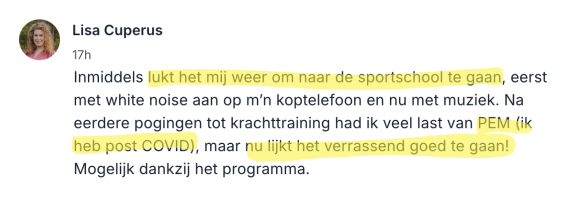 Na mijn COVID-besmetting bleef ik maandenlang extreem vermoeid. Elke keer als ik probeerde te sporten, kreeg ik een terugslag. In dit programma leerde ik hoe ik mijn inspanning beter kon doseren en rekening kon houden met PEM. Daardoor durfde ik weer te bewegen. Mijn energie is nu veel stabieler en ik heb minder ‘crashes’.