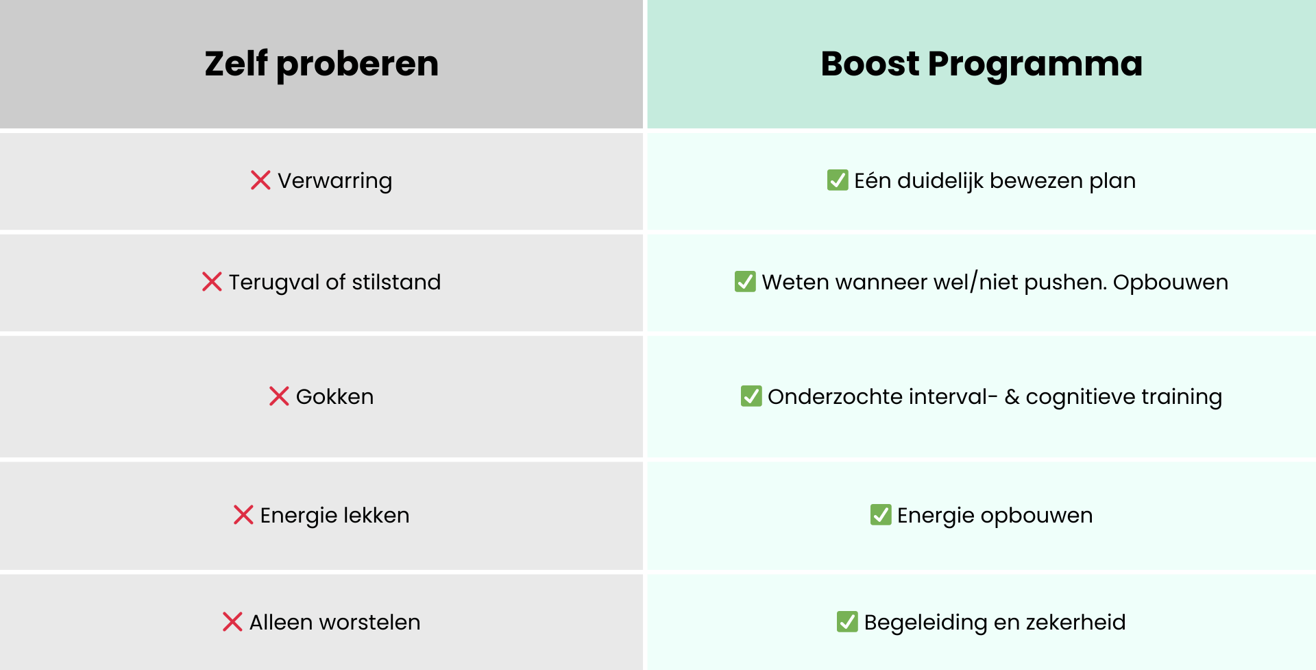 Het Boost Programma helpt je brein écht te herstellen: duidelijk, concreet, gebaseerd op 2 neuro-onderzochte methodes, met bewezen resultaten bij meer dan 2000 mensen.