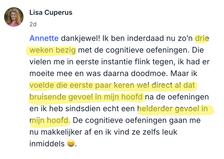 Het is een strategie die bewezen resultaten oplevert, die niet alleen tijdelijke verlichting biedt, maar ook op de lange termijn echt werkt. Duizenden andere mensen met een hersenschudding hebben interval- en cognitieve training toegepast en konden zo hun klachten verminderen.