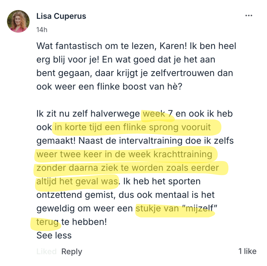 ✅ Sarah deelde dat ze zich eindelijk beter voelde dan ooit sinds haar ongeluk. Deze intervallen zijn de enige training die haar energie gaf zonder dat ze dagenlang last had van symptomen.