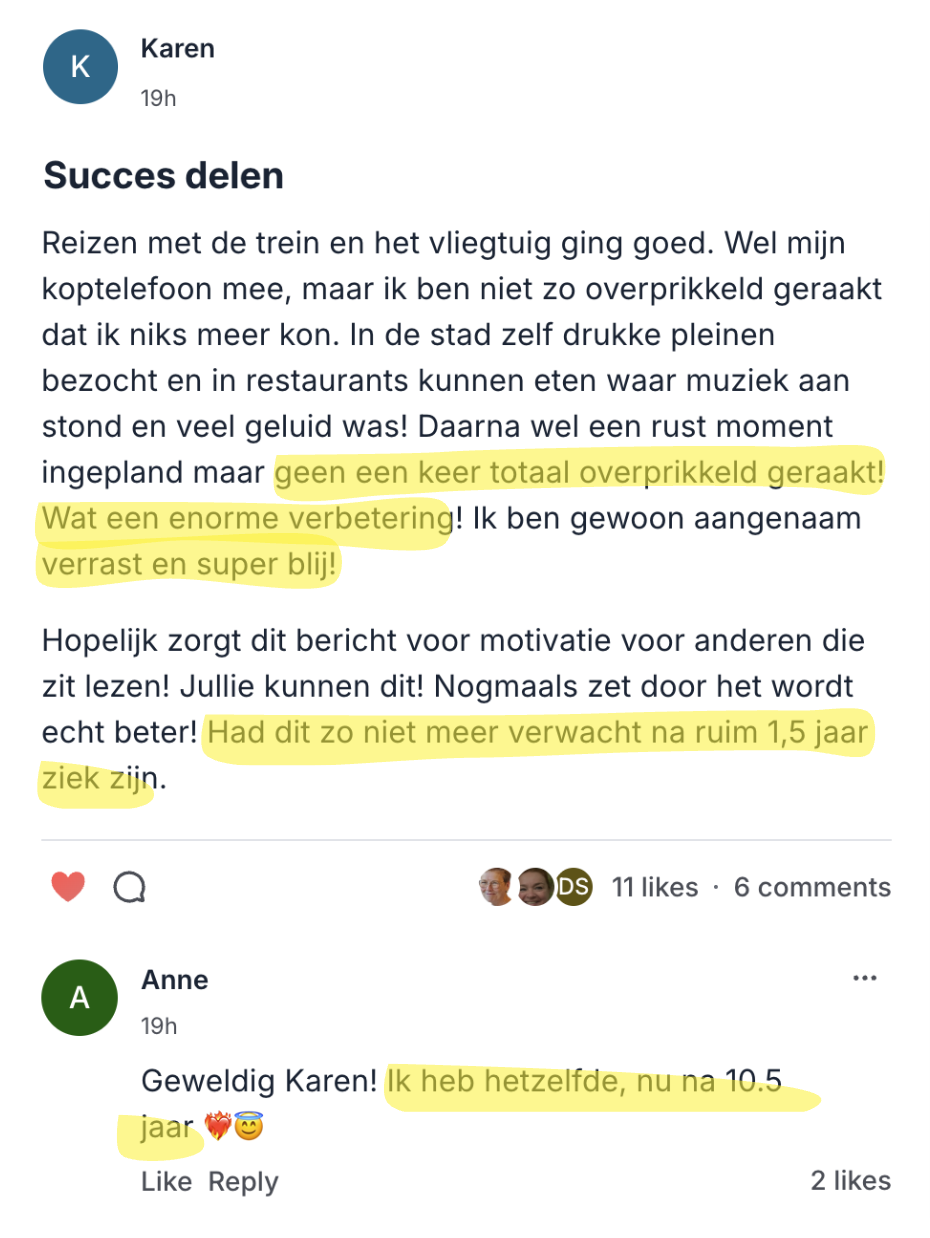 Je wilt spontaan kunnen leven, zonder elke minuut te moeten plannen vanwege je beperkte energie. Dat je eindelijk je noise cancelling headphones en zonnebril thuis kunt laten, omdat licht en geluid je niet meer overweldigen.