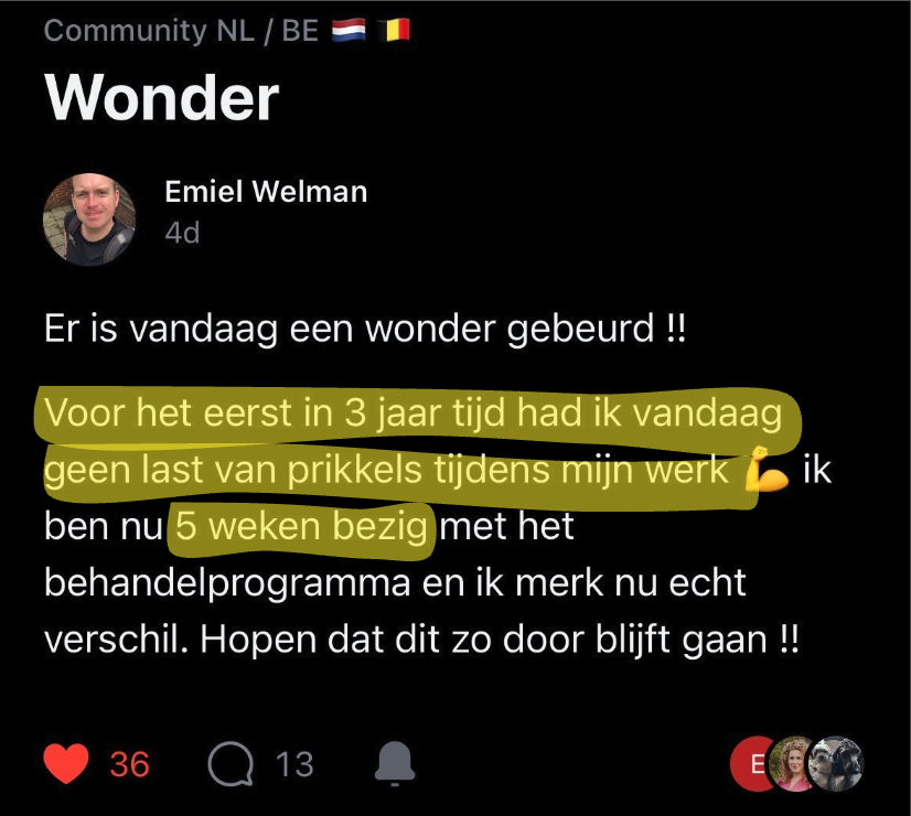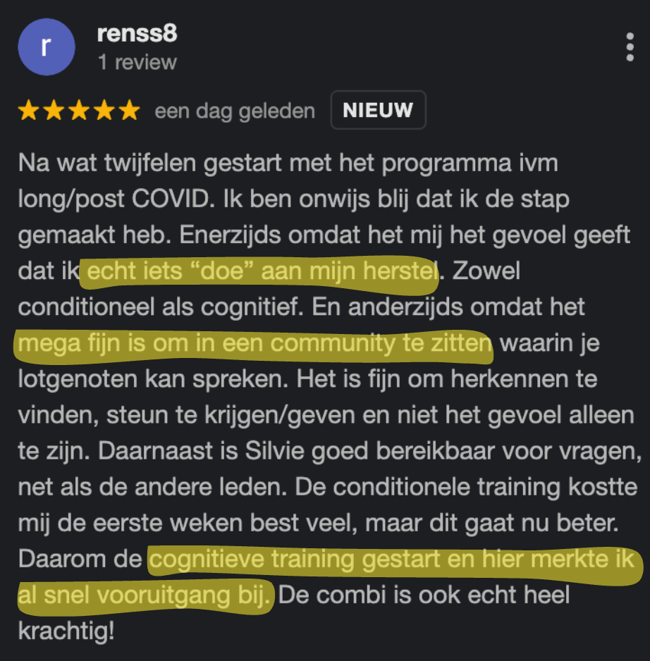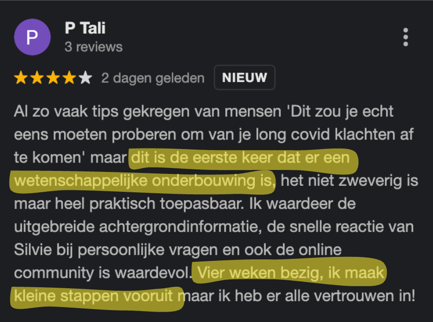 "Ik had maandenlang last van brain fog en hartslagproblemen na long-COVID (en PEM). Dit programma leert je niet alleen fysieke oefeningen, maar ook hoe je je brein rustig activeert. Stap voor stap merk ik dat mijn geheugen en energie verbeteren, zonder dat ik over mijn grenzen ga."