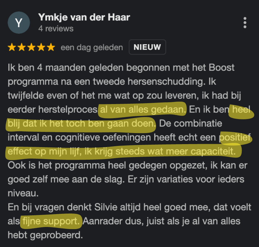 Ik ben deze week eindelijk begonnen met de interval- en cognitieve training. De grootste verbetering tot nu toe is dat ik een stabielere stemming en emoties merk (wat sinds de hersenschudding best een uitdaging was). Echt een boost voor mijn zelfvertrouwen!