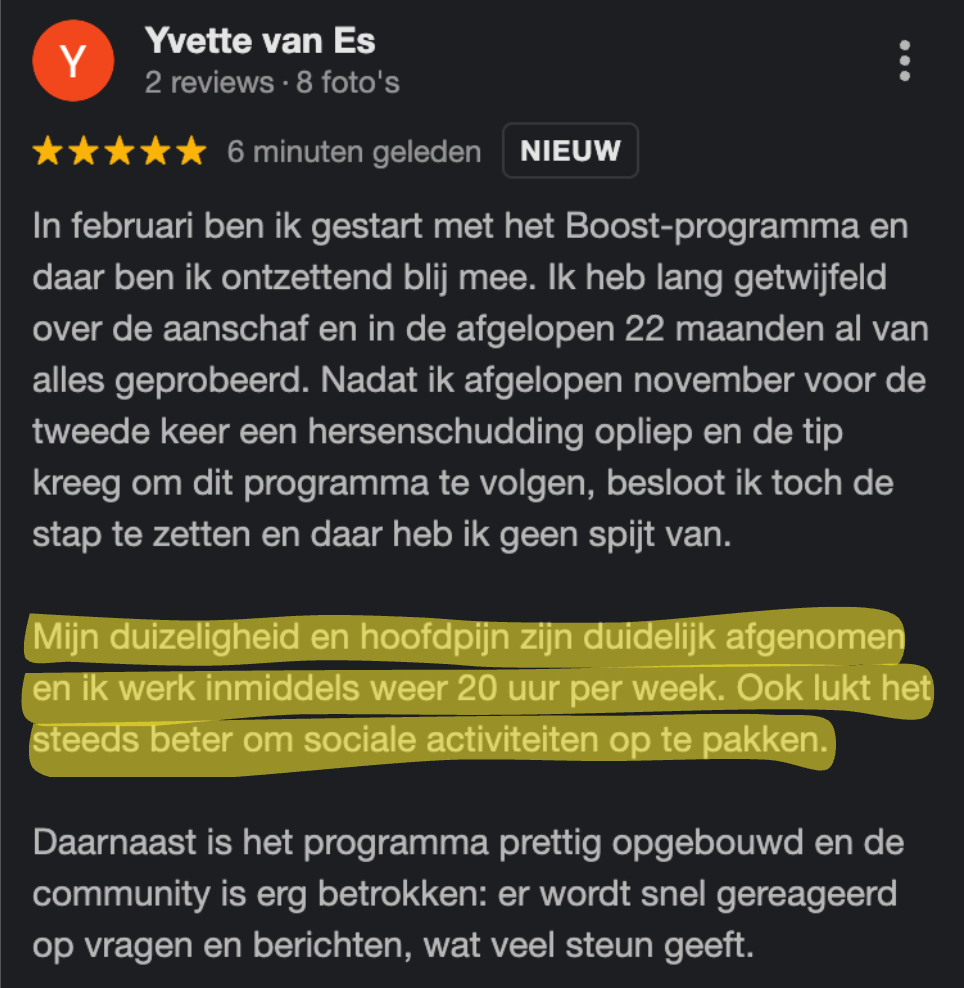 Ik heb zowel jouw intervaltraining als cognitieve cursus afgerond, en ze hebben me enorm geholpen bij mijn herstel.